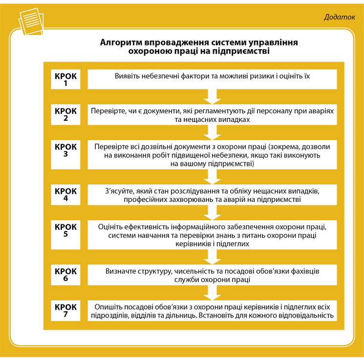 Стаття 13 Закону про охорону праці також визначає складові СУОП і покладає на роботодавця обов’язок розробити нормативну документацію з питань охорони праці