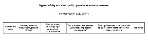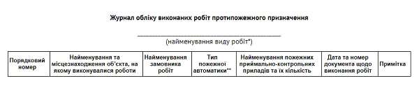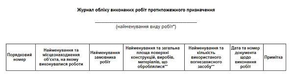 Журнал обліку виконаних робіт протипожежного призначення (Додаток № 6)