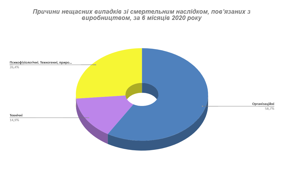 Серед причин нещасних випадків зі смертельним наслідком переважають (58, 7%) організаційні. Тобто, працівники нехтують вимогами інструкцій з охорони праці та посадових інструкцій, порушують правила безпеки та технологічного процесу. Друге місце в антирейтингу (26,4%) посідають психофізичні, техногенні, природні, екологічні та соціальні причини. На третьому місці — технічні (14,9%).