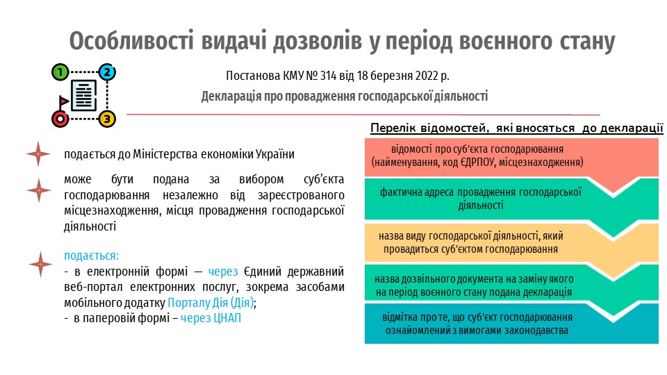 Також згідно Постановою № 357 більшість робіт та обладнання підвищеної небезпеки, що виконуються на підставі дозволу, на період воєнного стану здійснюються на підставі декларації відповідності матеріально-технічної бази вимогам законодавства з питань охорони праці.