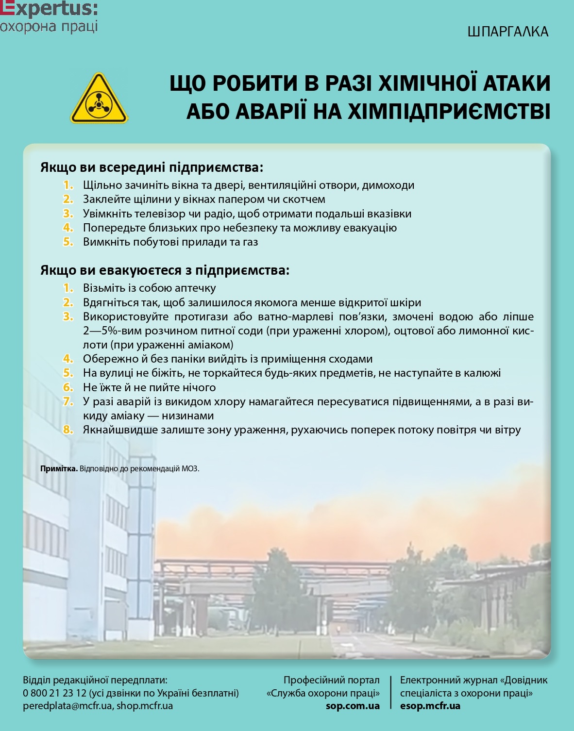 Під час війни зростає загроза хімічної аварії на режимних об’єктах або об’єктах інфраструктури. Як діяти правильно під час такої аварії, підкаже наша шпаргалка.